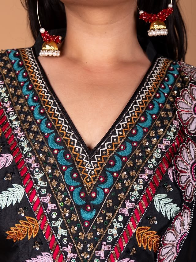 This black ethnic set features rich multicolor floral embroidery that adds a bold and elegant statement.