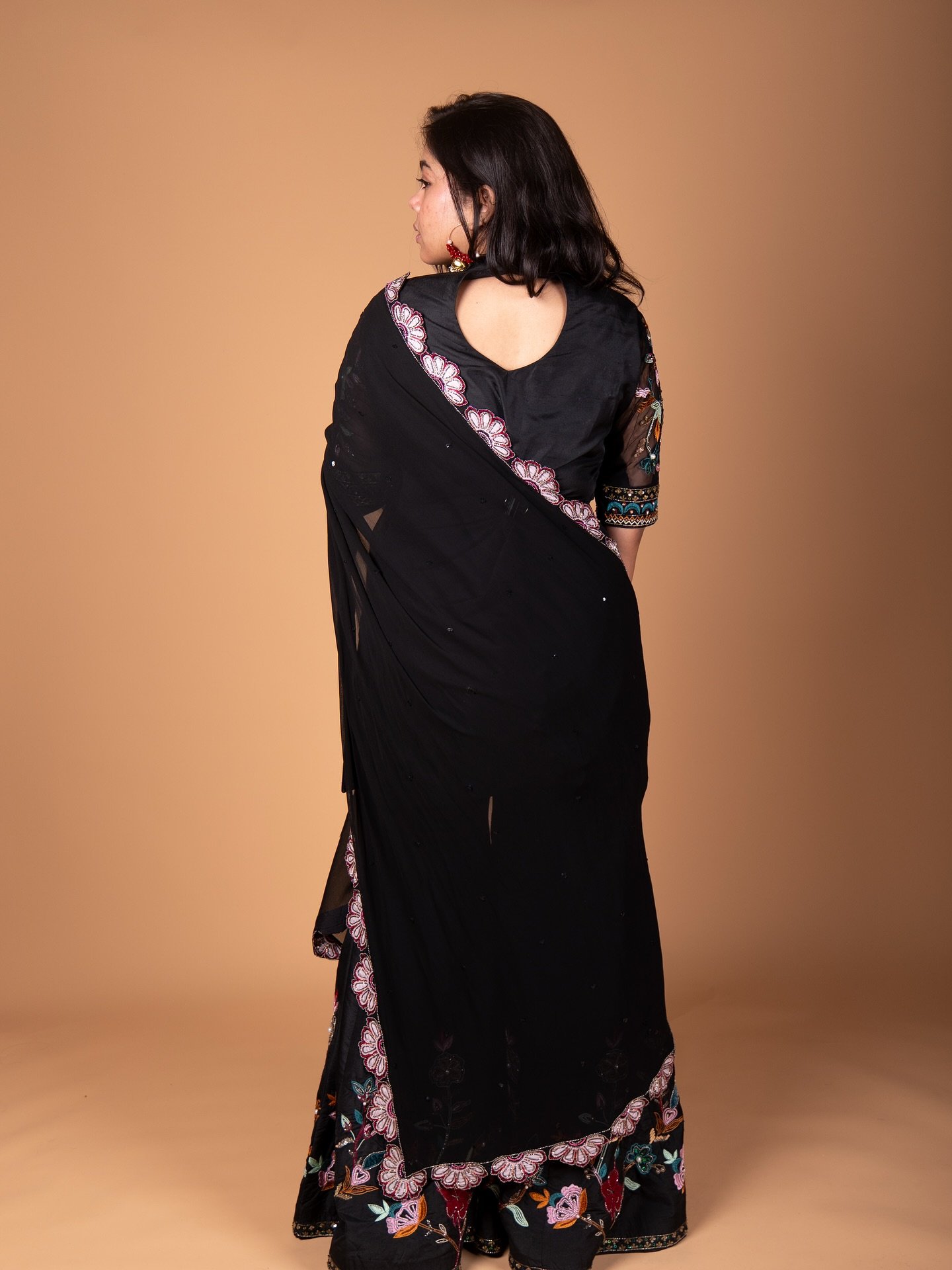A beautifully detailed black embroidered set with vibrant floral work and matching dupatta.