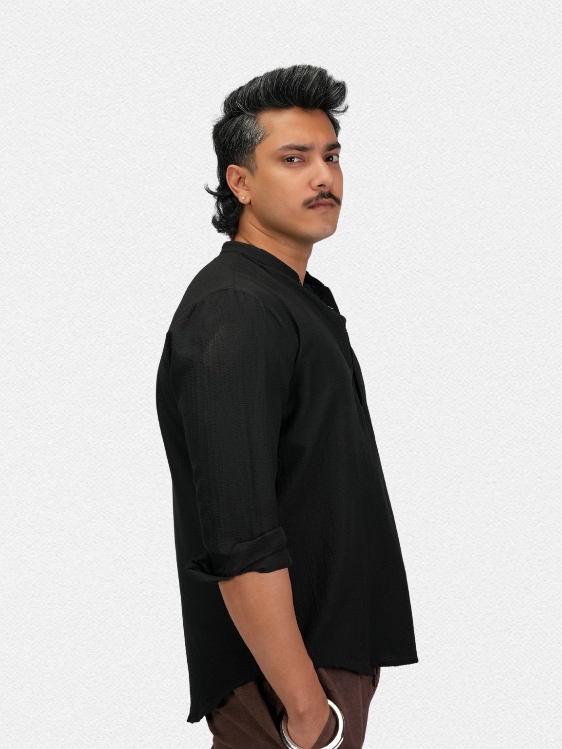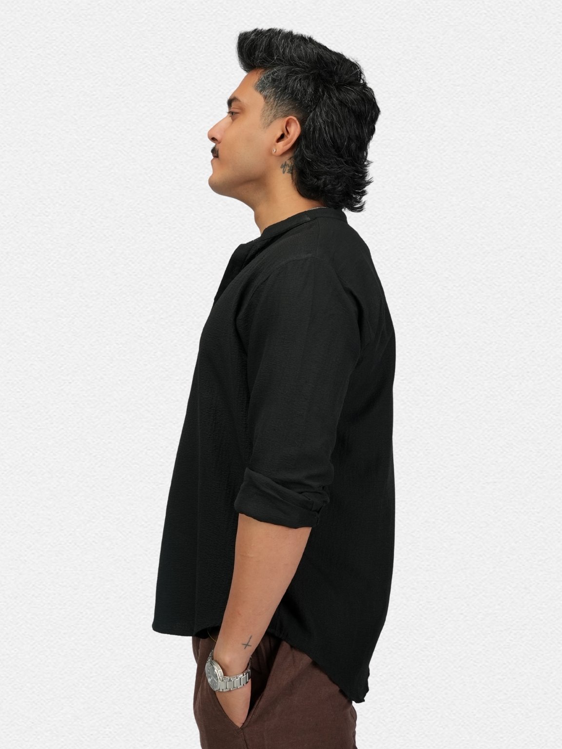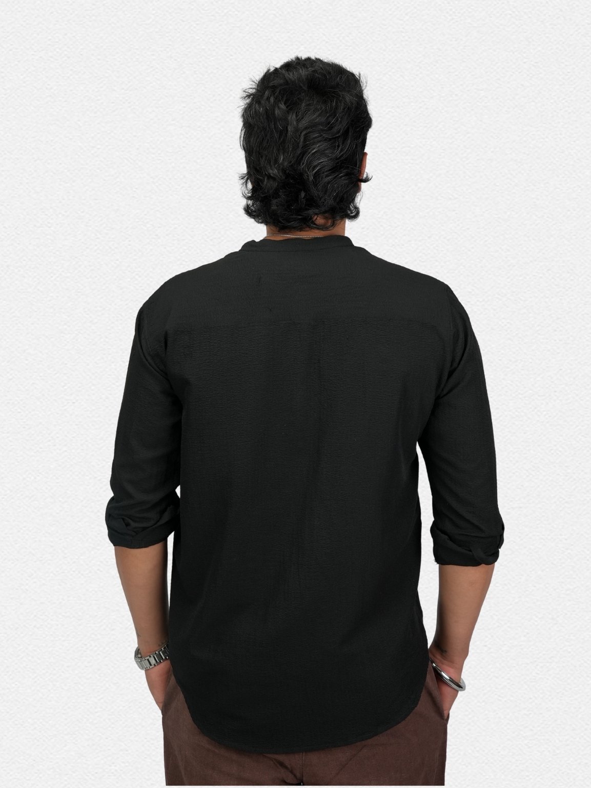 Lightweight black textured kurta with a classic mandarin collar for easy everyday wear.