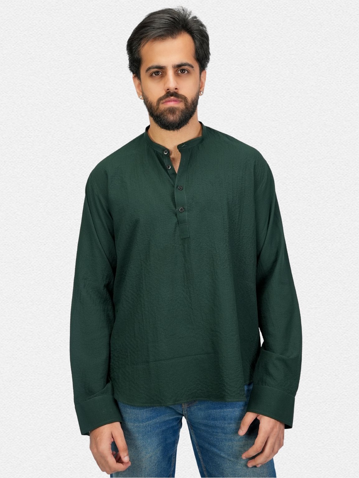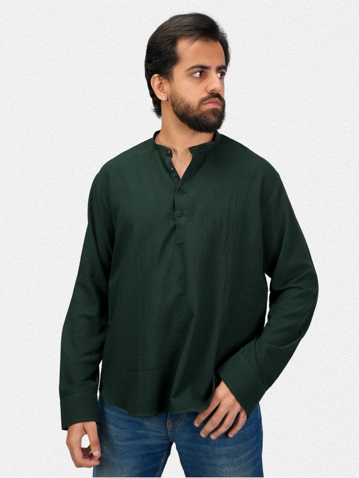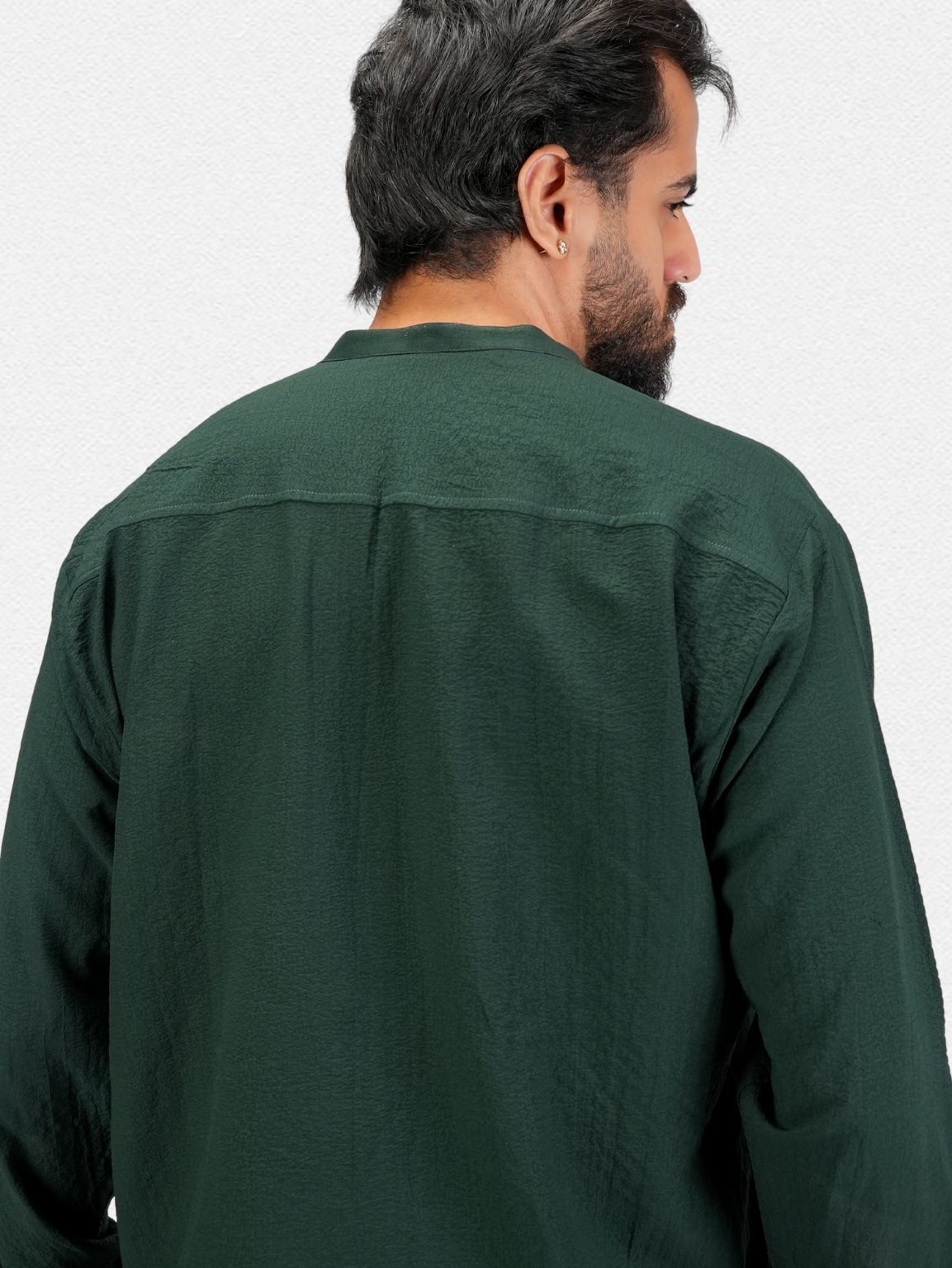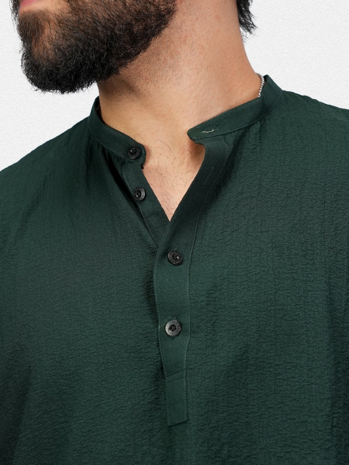 Rich dark green textured kurta with a clean mandarin collar for modern everyday style.