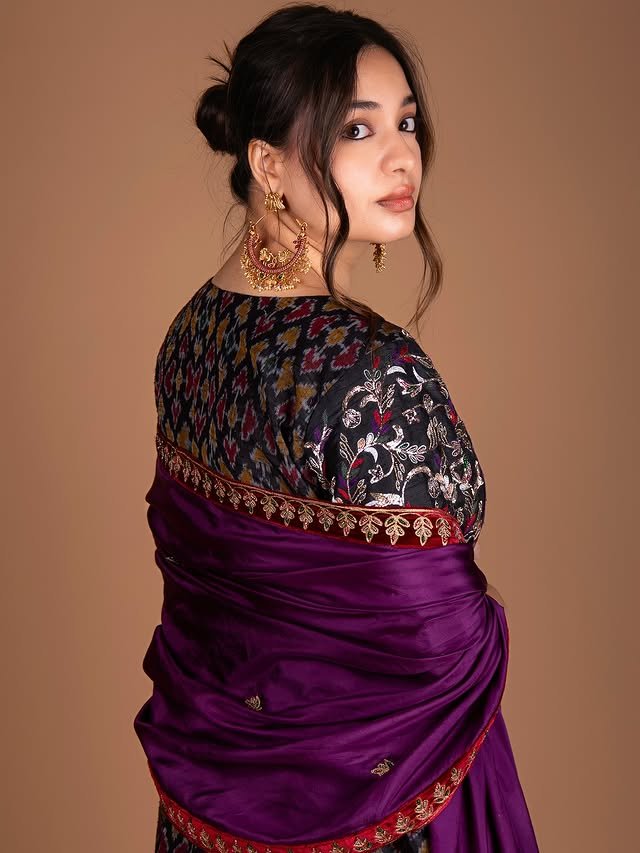 A vibrant ikat printed set paired with a rich purple embroidered dupatta.