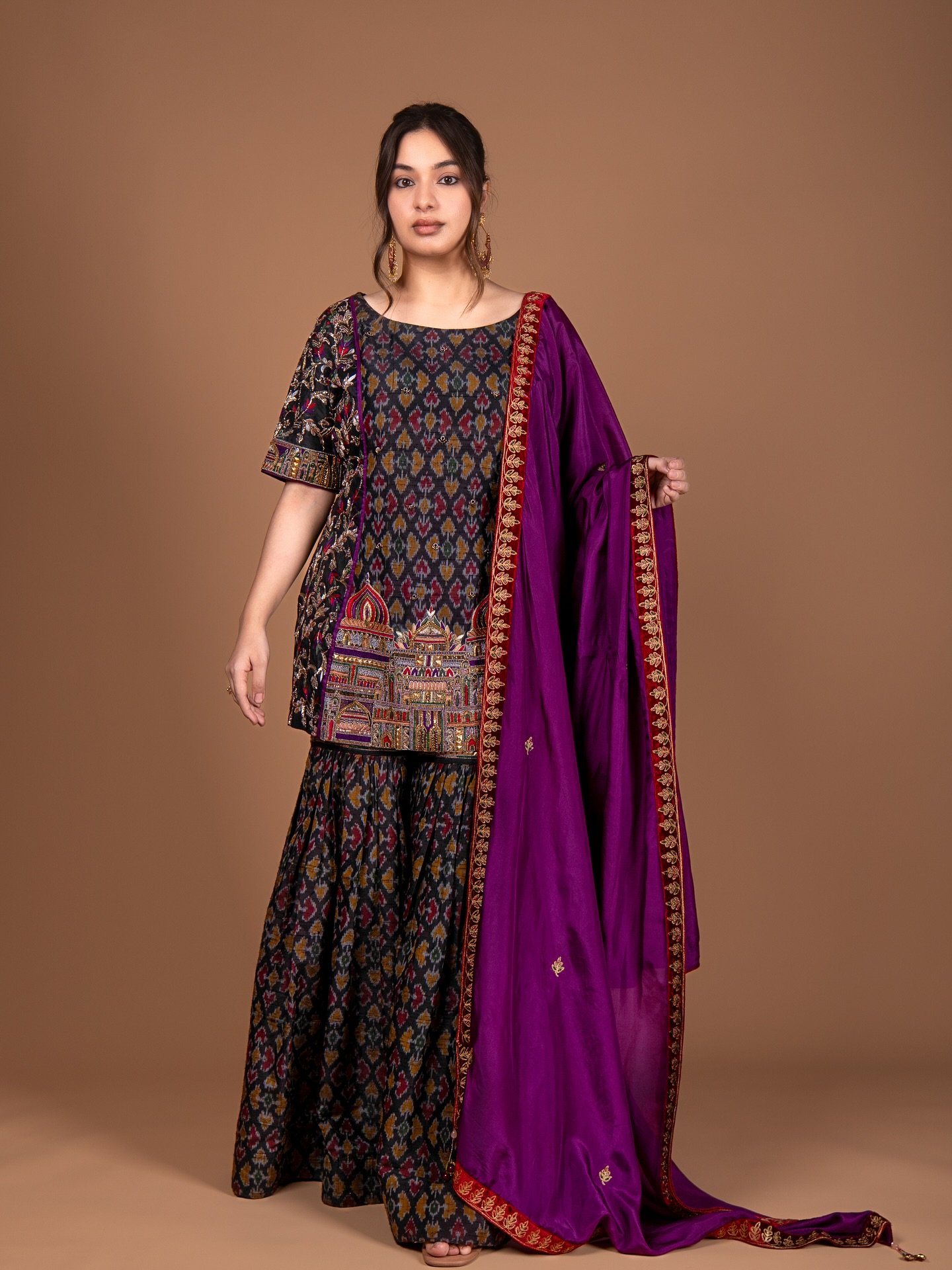This stunning ethnic set features a multicolor ikat print top and sharara, offering a bold yet elegant look.