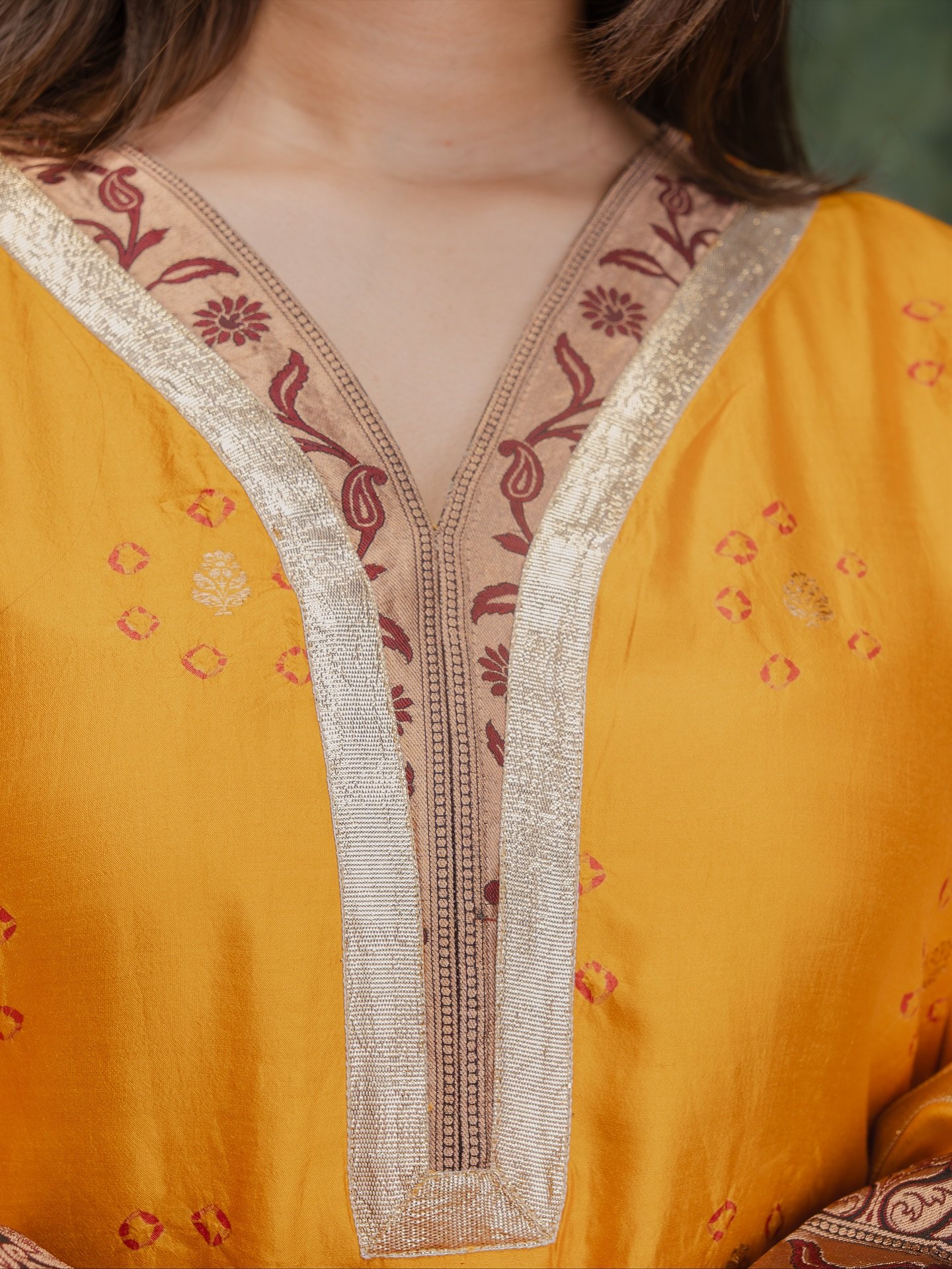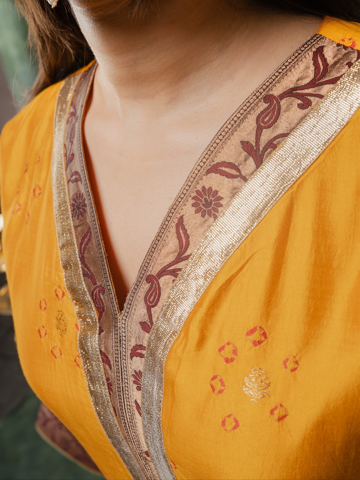 This elegant mustard kurta features delicate embroidery with beautifully detailed maroon borders on the sleeves and hem.