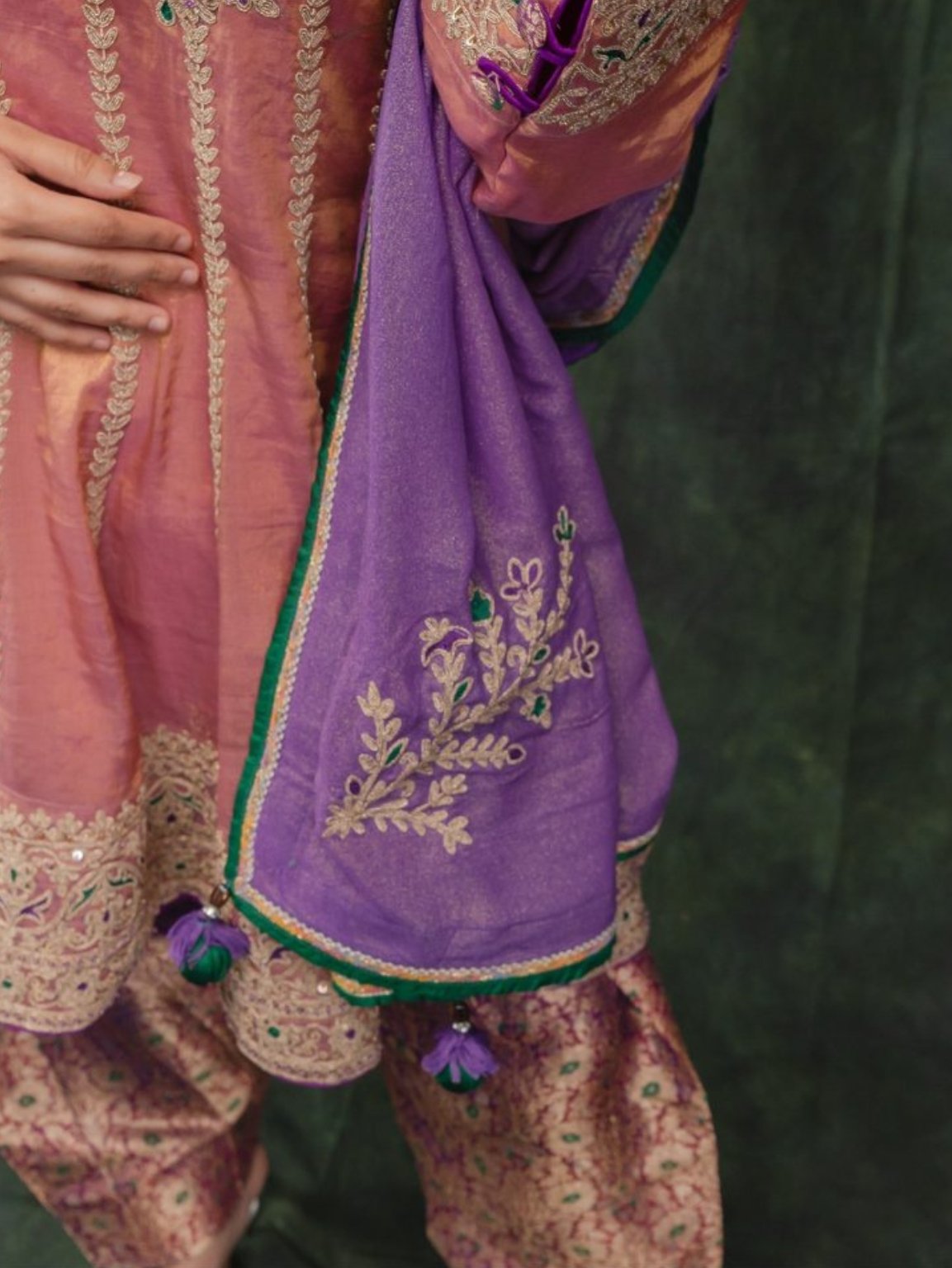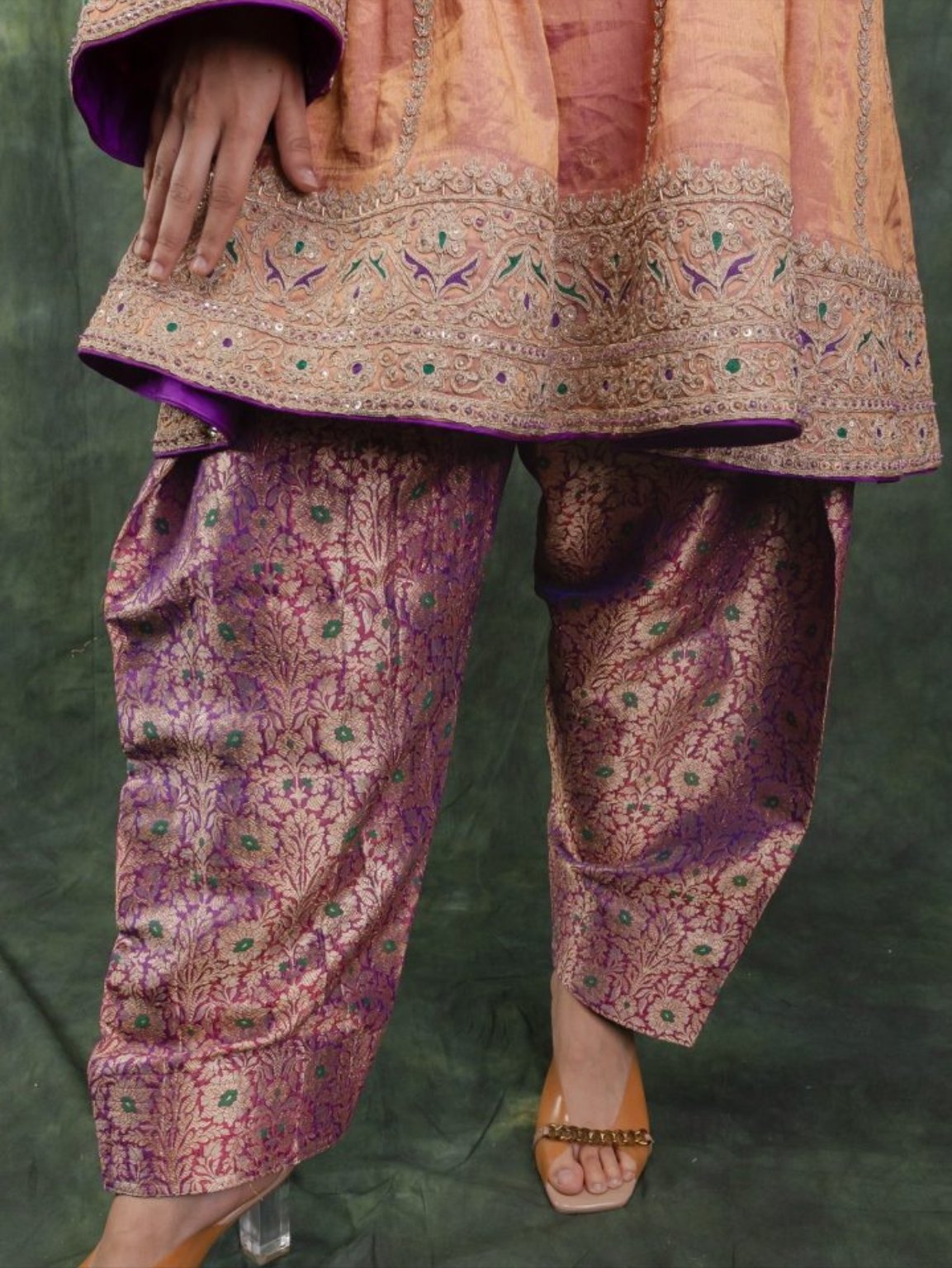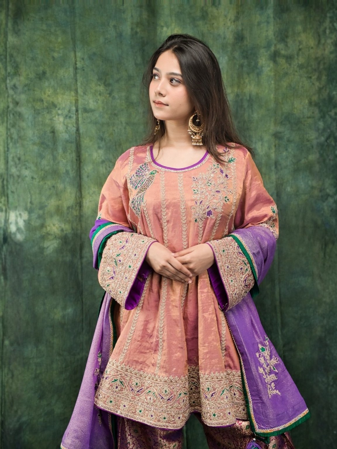 A peach embroidered kurta dress with rich detailing and contrast purple finishing.