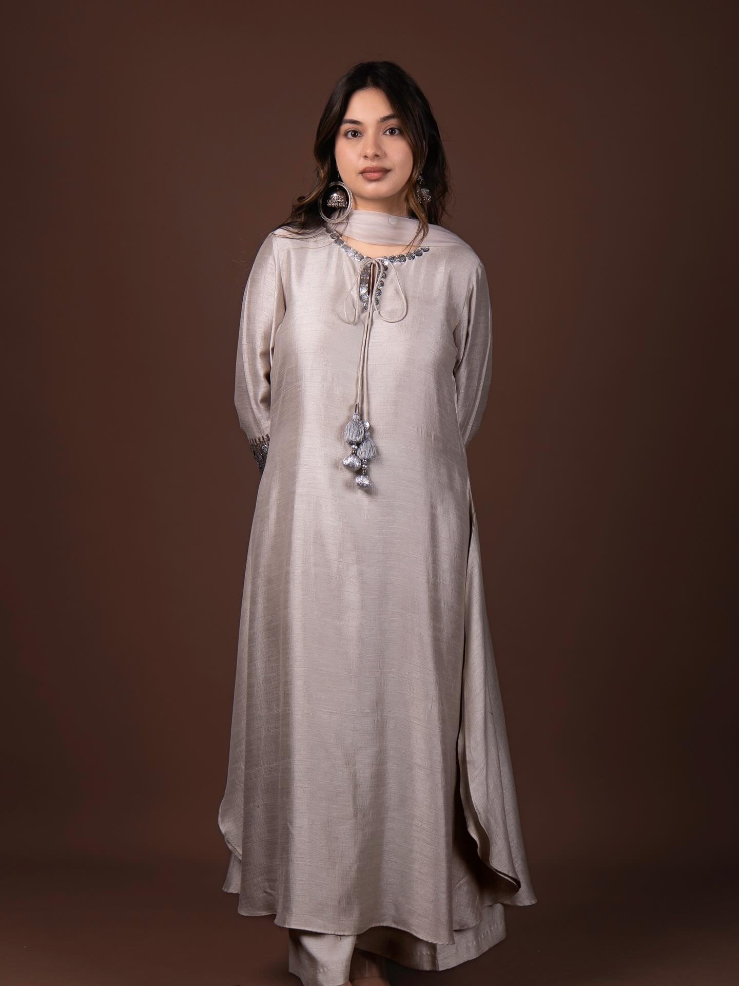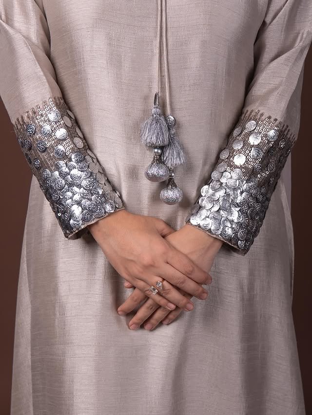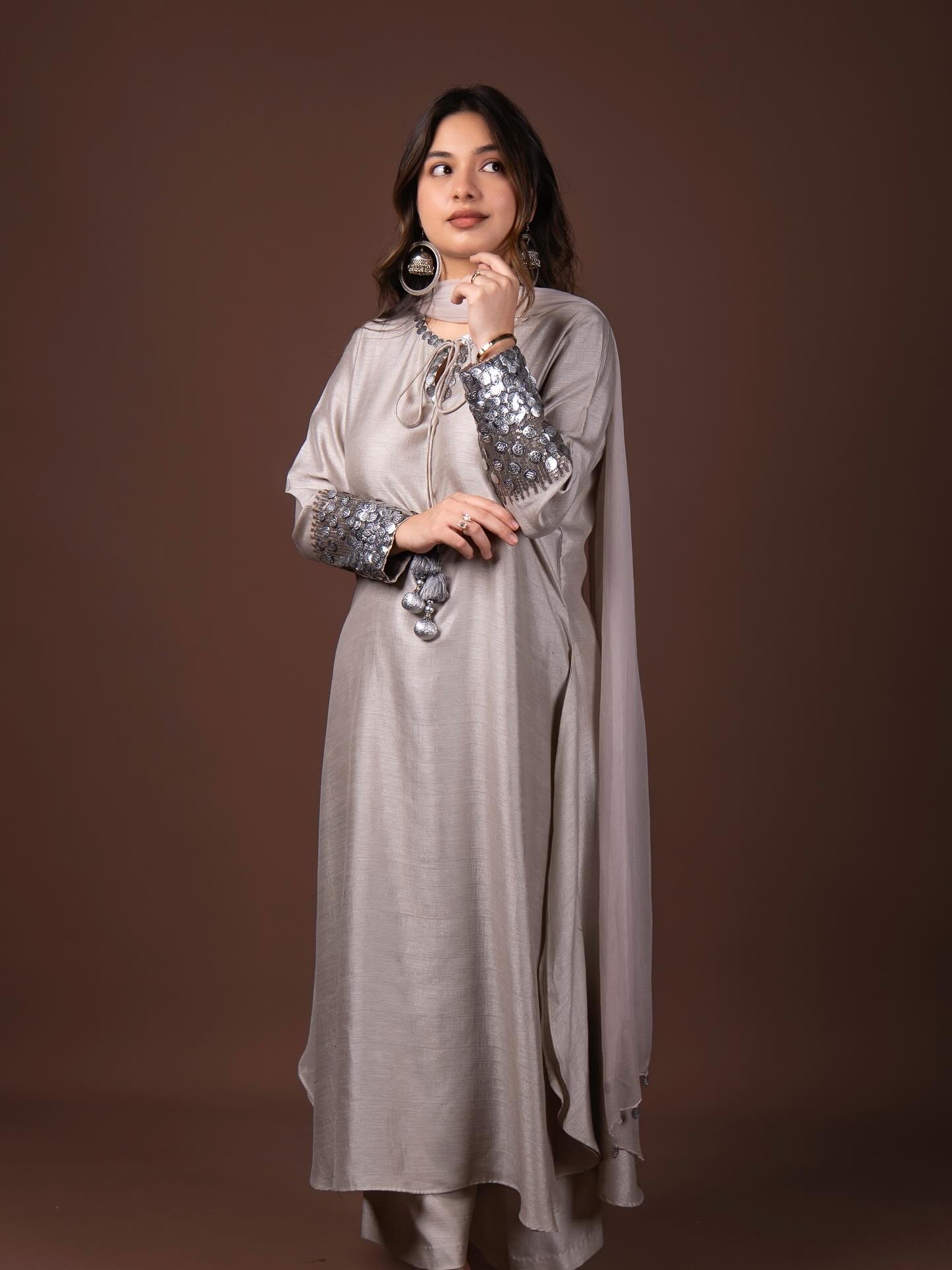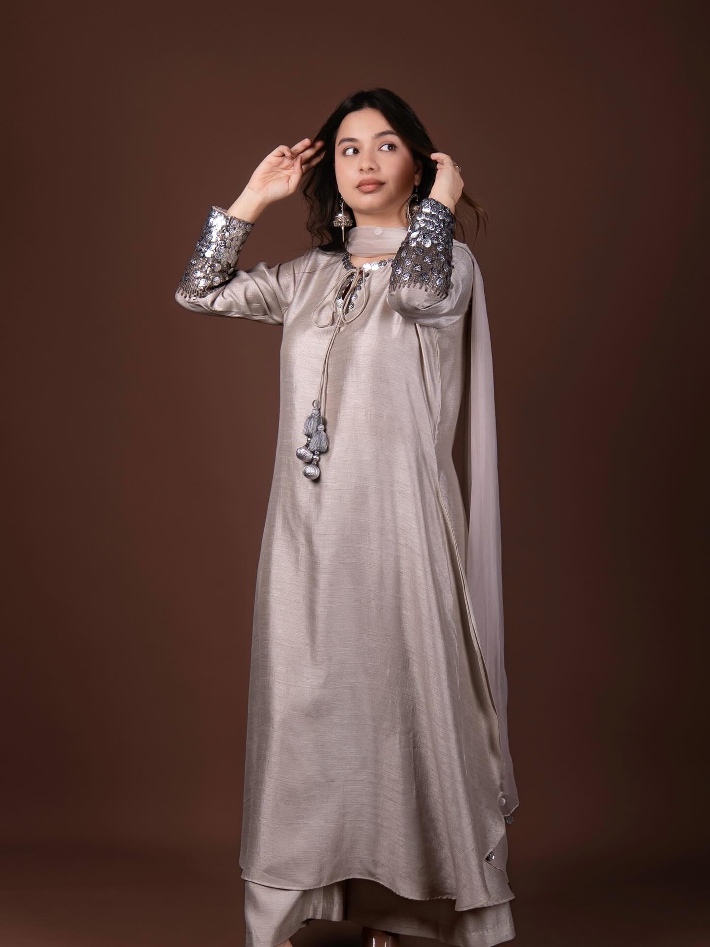 A graceful silver kurta set with mirror-work sleeves and a matching dupatta.
