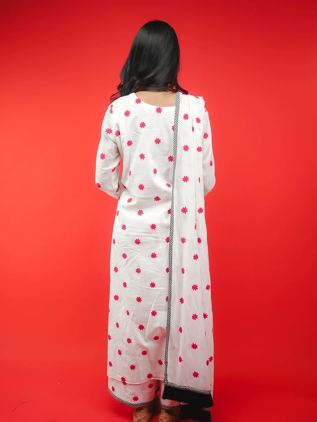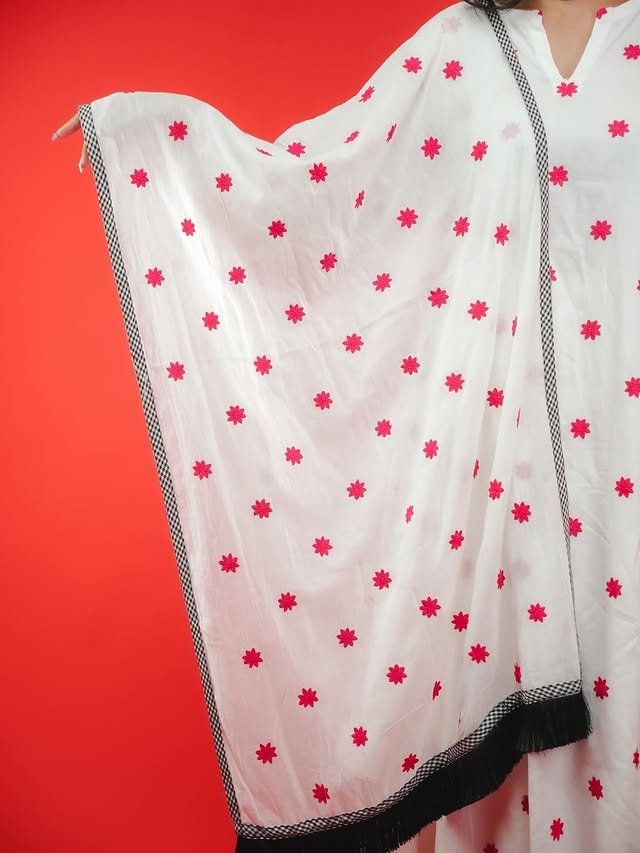 A white frock-style dress with pink floral motifs and a matching dupatta.