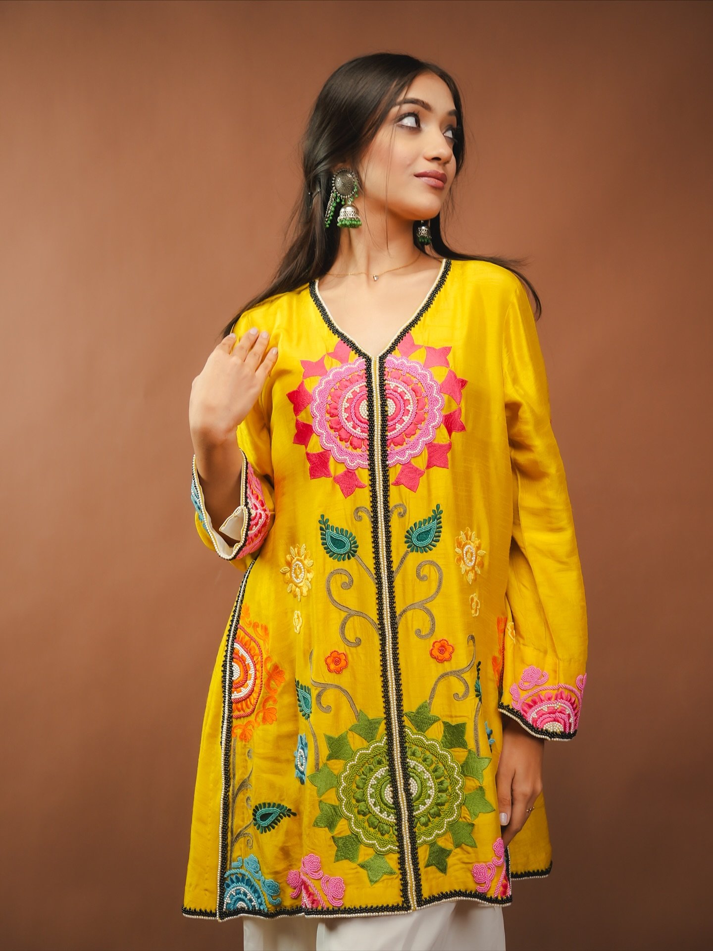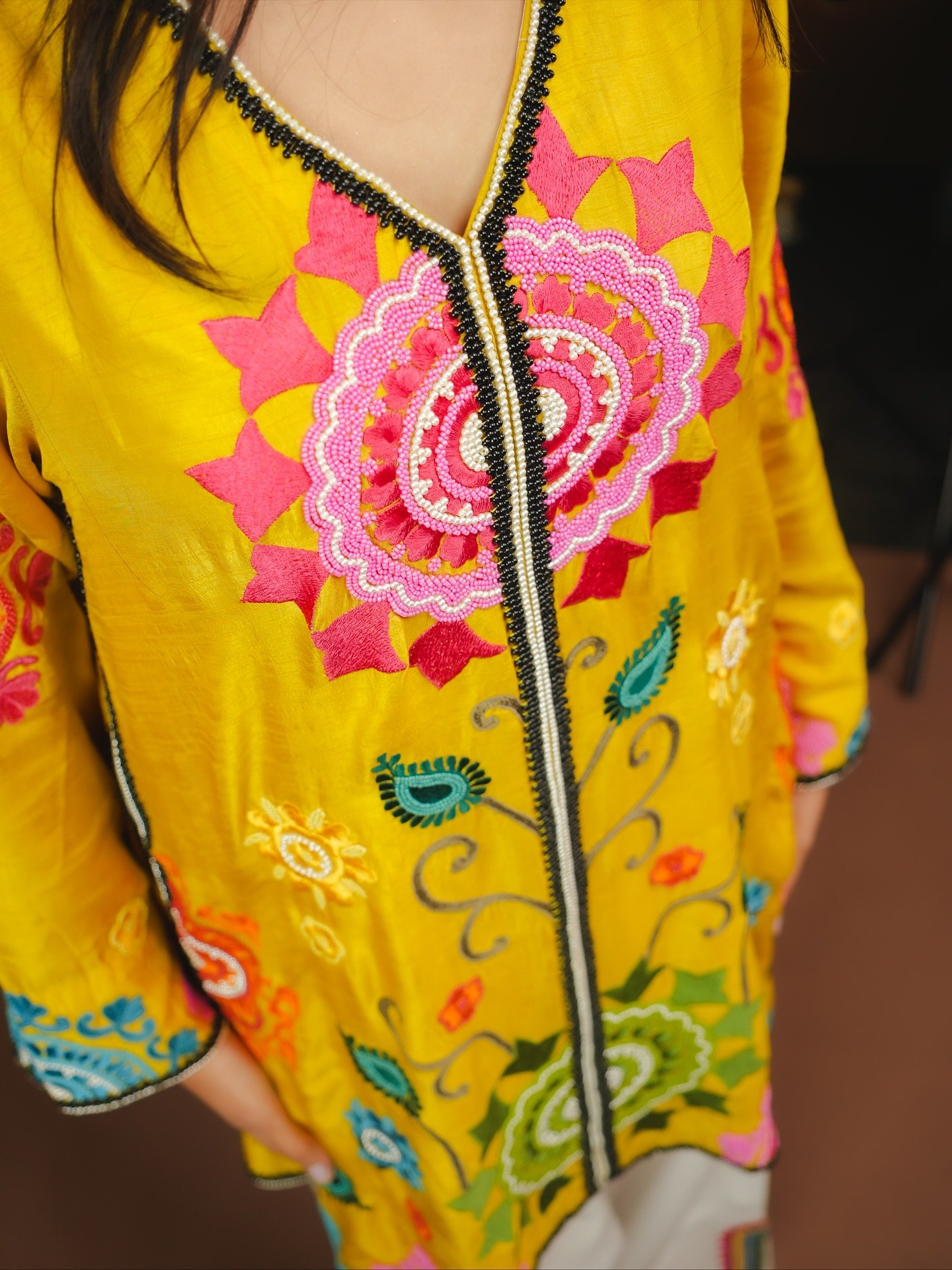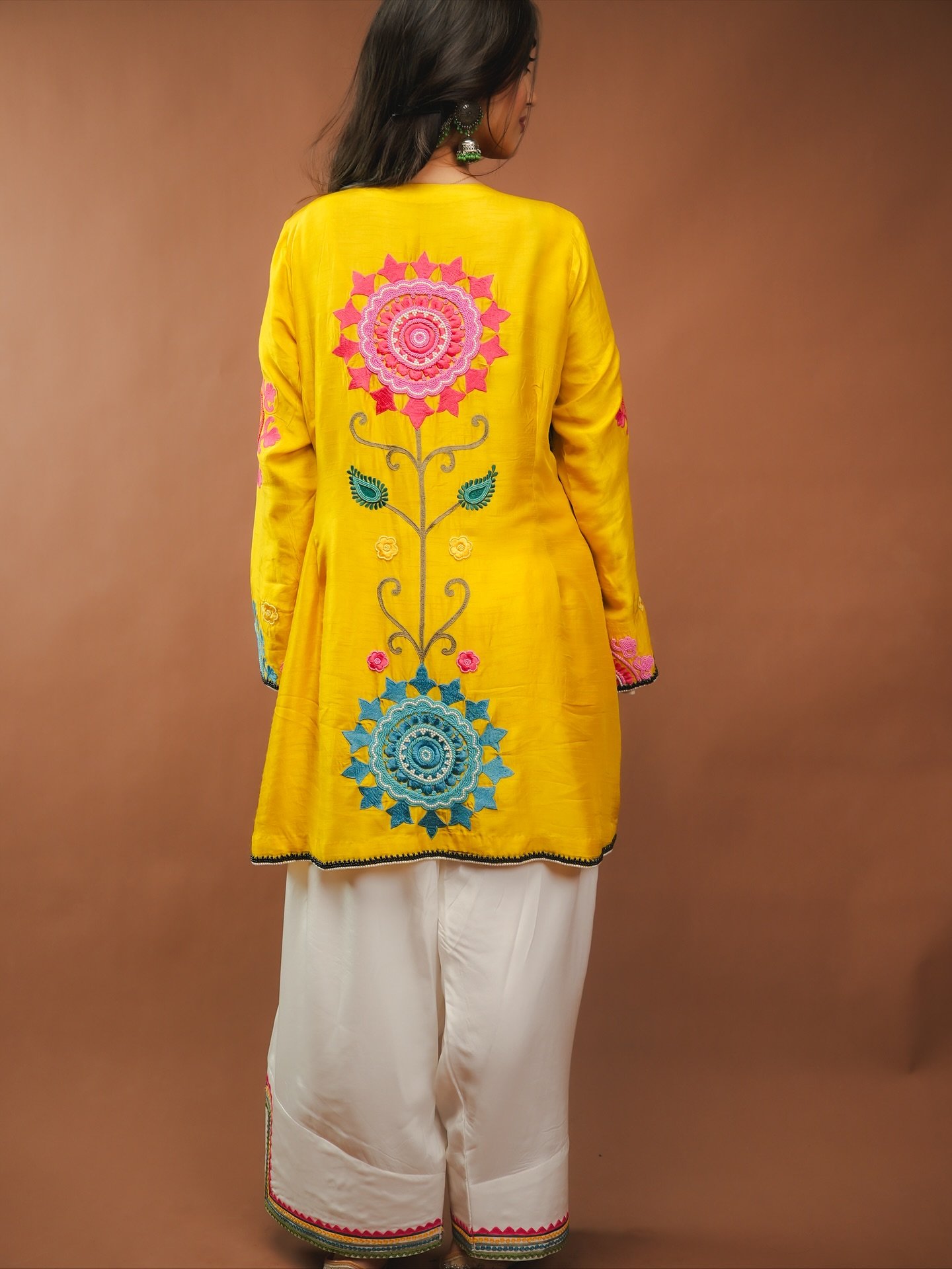 The soft yellow fabric paired with wide embroidered trousers creates a stylish, breezy silhouette.